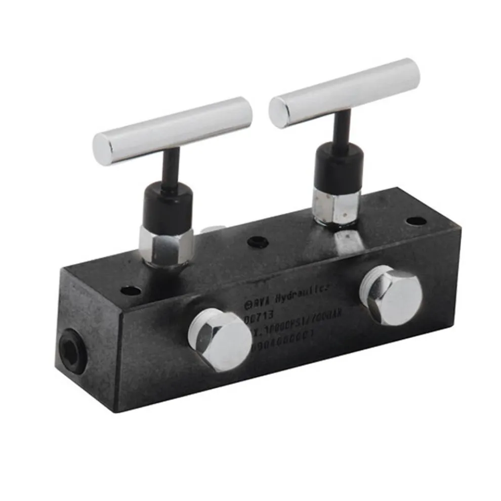 Manifold with Two Needle Valve. 3 Oil Ports, Port Size 3/8″-18NPTF. Mounting Hole 4.4. Pressure Rating: 10,000 PSI