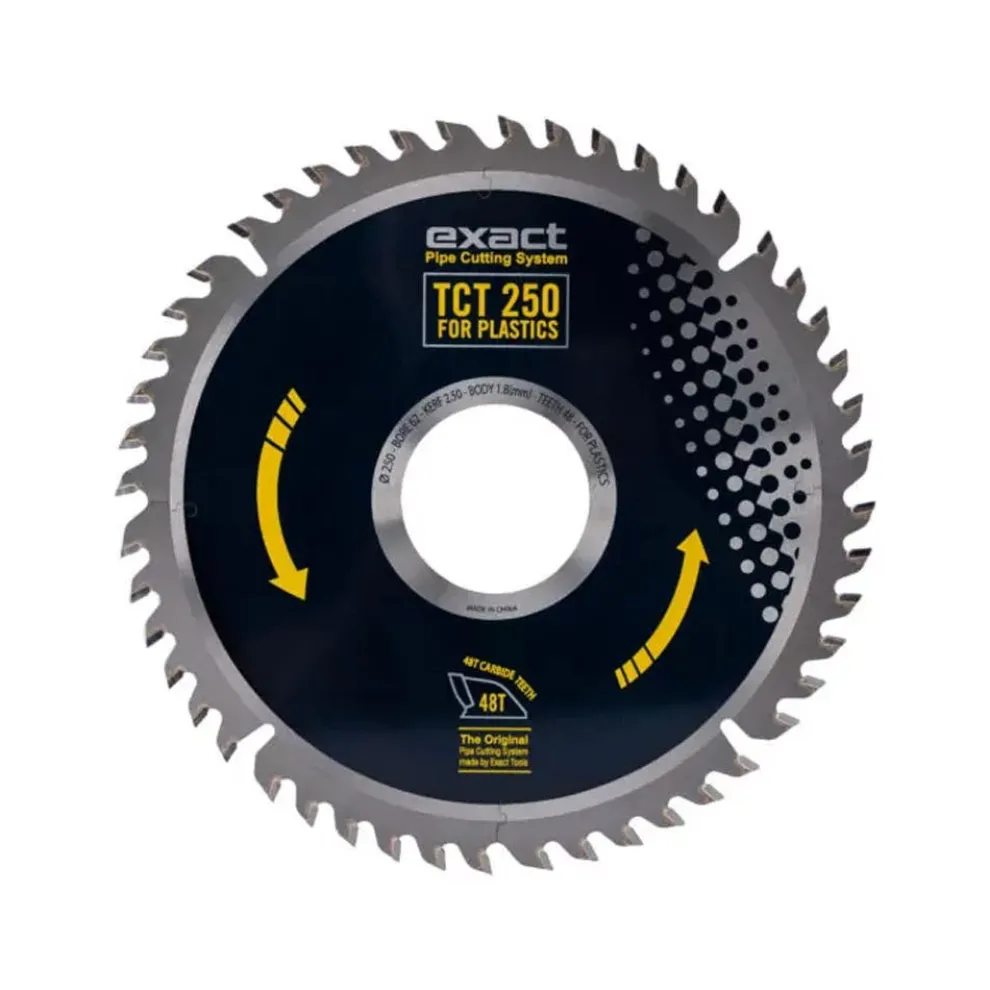 TCT P250 is a large saw blade intended for the use of Exact PipeCut P1000 pipe saw.With this saw blade you will make seamless and smooth cuts on varying plastic pipe materials.The tips of blade are tungsten carbide tips for general use. The blade is long lasting on plastic pipe cutting application, but when the tips do start to become blunt, the blade can be sharpened to renew the sharpness. This can be done a few times over the blade’s total life cycle.