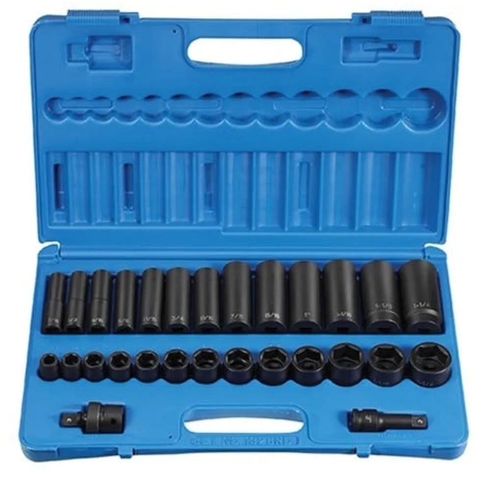 Set contains 6 Point sizes 7/16″ to 1-1/4″ in both standard and deep lengths; plus a 1/2″ x 1/2″ universal joint and 3″ extension.Set Contains 28 Pieces