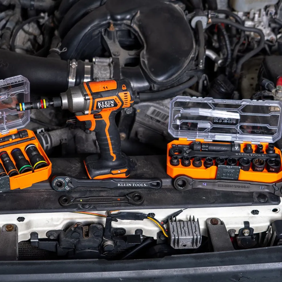 - Klein KNECT (M) Pass Through Socket Set with 11 sockets, extension, impact adapter, 3/8-Inch square adapter, and handle