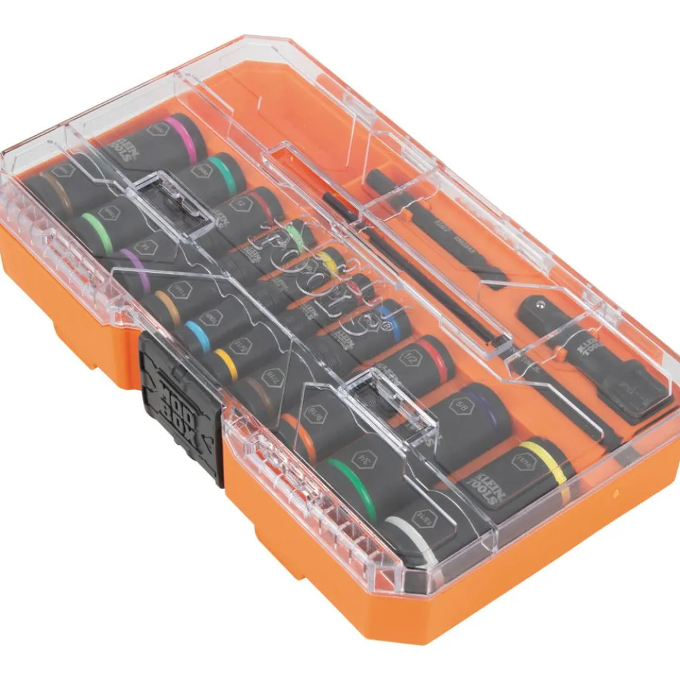 This 20-Piece impact socket set features (10 SAE and 10 Metric) sizes combined into 10 color-coded sockets. Each impact flip socket features two coaxial spring-loaded sockets in one. Set includes Nested adapters for dual drive (1/4-Inch hex flip socket shaft nest into 3/8-Inch square drive adapter). Also comes with a Compact, modular storage system with a clear lid that is compatible with MODbox and stackable with other cases of its similar design.