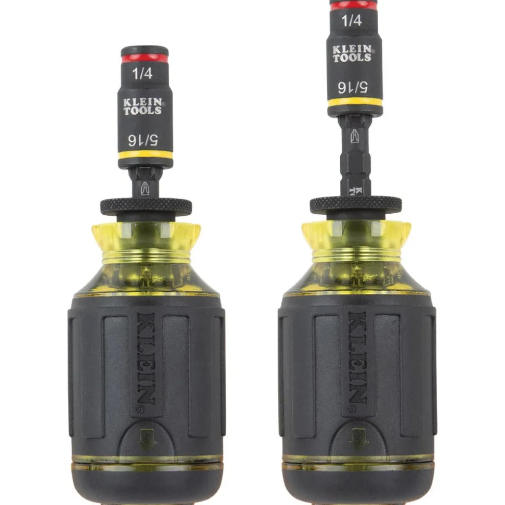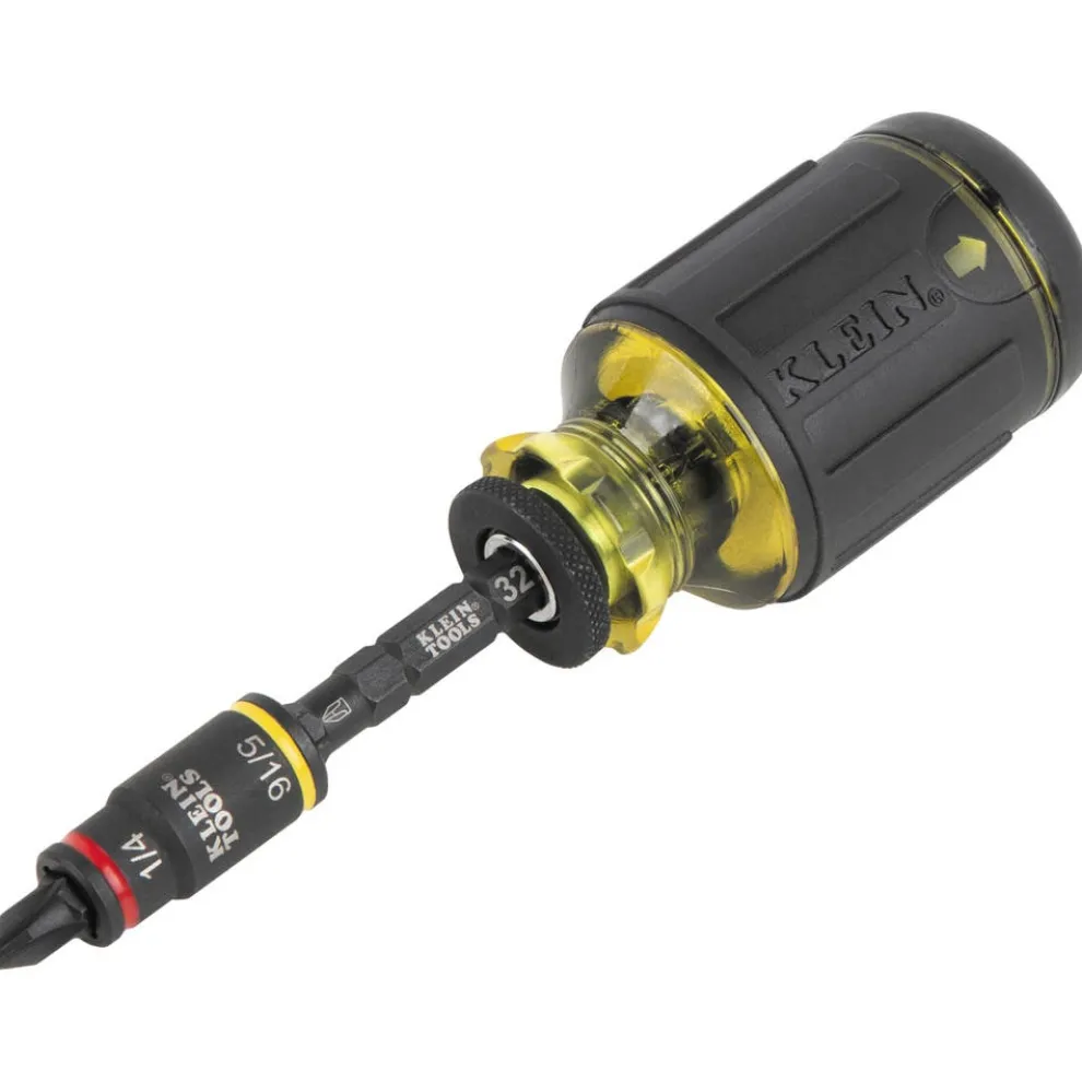 Klein’s 10-in-1 Impact Stubby Screwdriver Set is small to allow easy access to tight work spaces. Cushion-Grip™ handles provide greater torque and comfort. Includes a multi-purpose flip socket, 7 different screwdriver bits conveniently housed in handle, and a 1/4-Inch quick-connect for use in an impact driver or screwdriver handle.