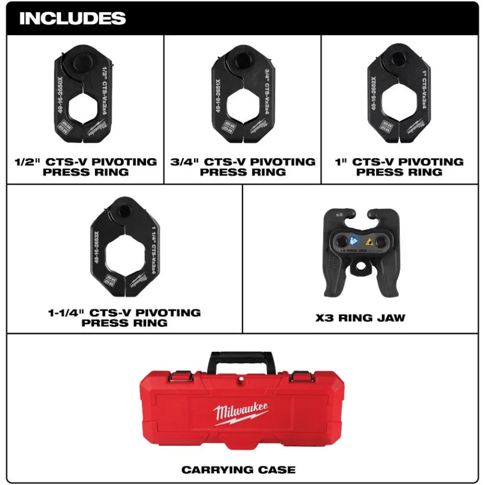 The MILWAUKEE 1/2″ – 1-1/4″ CTS-V Pivoting Press Ring Kit is designed for use with the M12 FORCE LOGIC Press Tool on Viega ProPress, Apollo Press and other press fitting systems. The CTS-V Pivoting Press Ring Kit is a more efficient alternative to sweat and solder, enabling you to press connections on 1/2″ – 1-1/4″ copper and copper tube-sized (CTS) stainless steel pipe. Pivoting functionality delivers greater access in tight spaces when paired with the X3 Ring Jaw & M12 FORCE LOGIC Press Tool. Additionally, Milwaukee’s press blocking system prevents improper ring and ring jaw mismatch providing peace of mind in quality connections. The 1/2″ – 1-1/4″ CTS-V Pivoting Press Ring Kit, combined with the ring jaw and in-line M12 FORCE LOGIC Press Tool, delivers unrivaled access in tight spaces and around installed pipes, providing you with controlled, flameless copper connections for unmatched productivity.