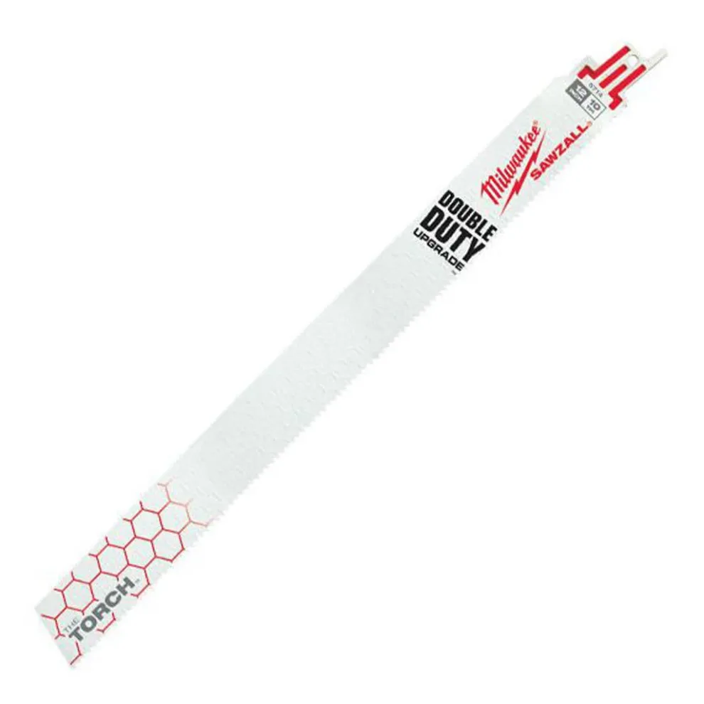THE TORCH metal-cutting blades with the Double Duty Upgrade feature a tooth form optimized for the longest life and maximum durability. Tough Neck is engineered to protect against tang breakage and delivers the strongest SAWZALL blade tang on the market. Grid Iron features a stamped honeycomb pattern throughout the body of the blade that greatly increases the rigidity of the blade, making it the stiffest metal cutting SAWZALL blade on the market. These blades are ideal for making tough, straight cuts. Bullets: optimized tooth design providing 2X more life than our previous generation SAWZALL blades; Tough Neck ribs strengthen the blade tang and minimize breakage; Grid Iron honeycomb pattern increases blade rigidity to resist blade buckling.
