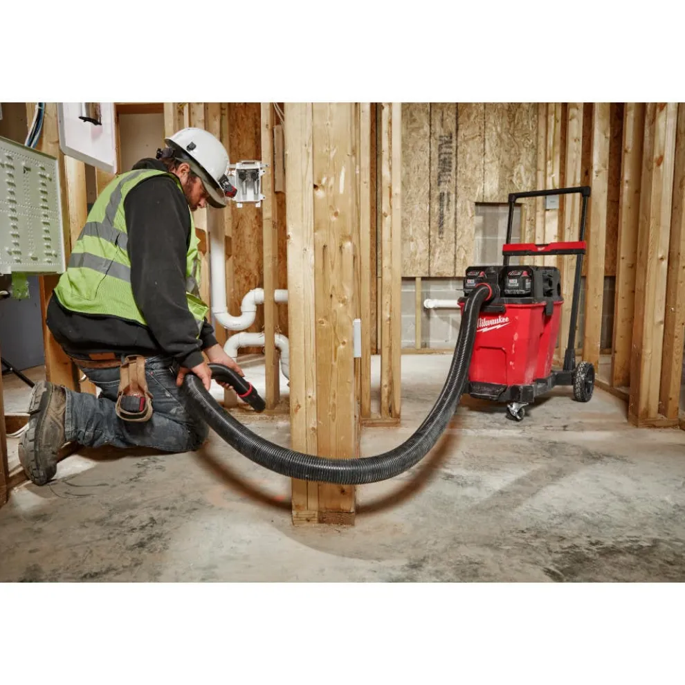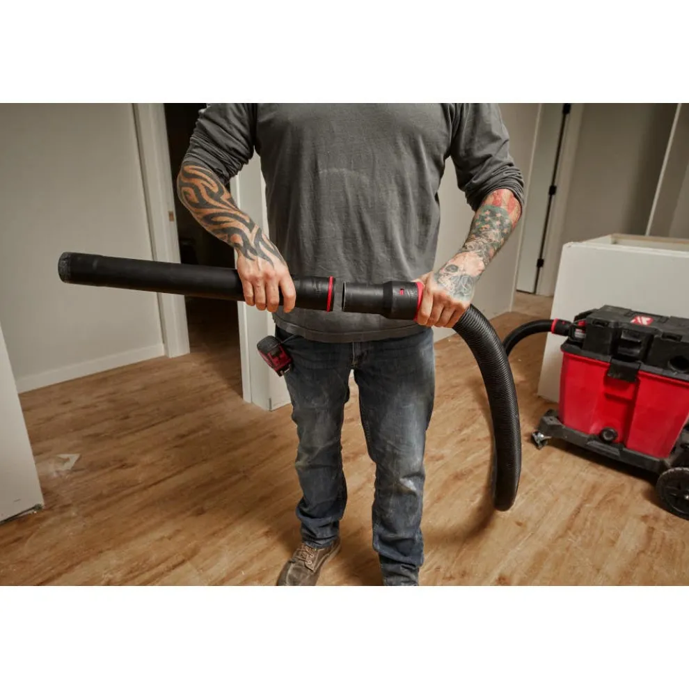 The MILWAUKEE 2-1/2″ x 9′ Flexible Hose delivers unmatched durability and flexibility to survive the jobsite. Its two-part design allows for durable and crush-resistant construction to prevent tears that lead to downtime on the jobsite. The anti-static hose material helps prevent static buildup when cleaning fine particles. The high-performance swivel mechanism and hose material create more flexibility and ease of use during cleaning, preventing the hose from getting bound up or kinked while moving around. The dedicated custom rubber gasket improves airflow and performance when in use. This Milwaukee flexible vacuum hose includes a red color ring for quick identification of its 2-1/2″ diameter.