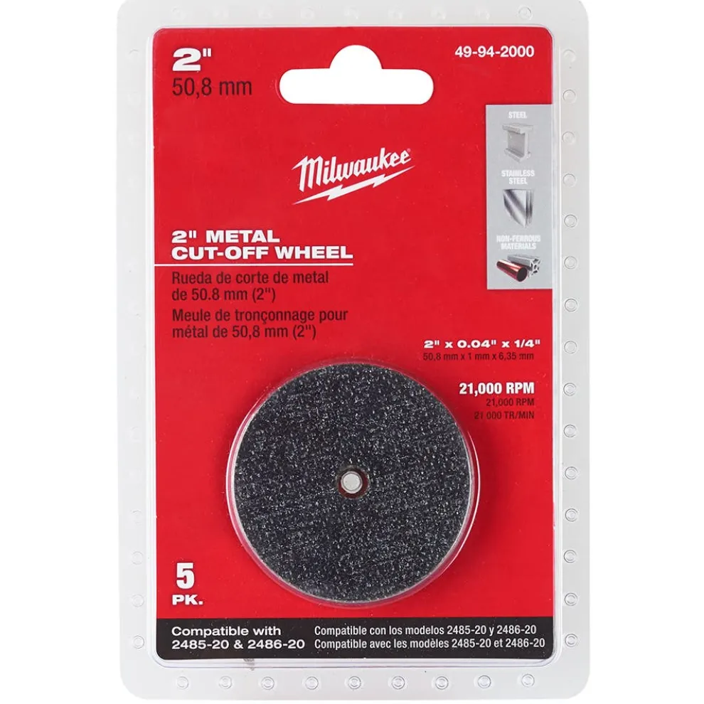 2″ Metal Cut Off Wheel as a 5-pack of 2 in. x 0.04 in. x 1/4 in. cut-off wheels. Rated for a maximum of 21,000 RPM this wheel is an ideal solution for cutting stainless and other metals quickly and efficiently. Milwaukee’s comprehensive offering of grinding and cutting wheels consists of 45 unique products ranging in diameters fom 3 in. to 14 in. with arbor configurations of 3/8 in, 7/8 in, 20mm, and 5/8 in. Milwaukee’s abrasive offering provides products ranging from general-purpose to specialized high-performance applications.