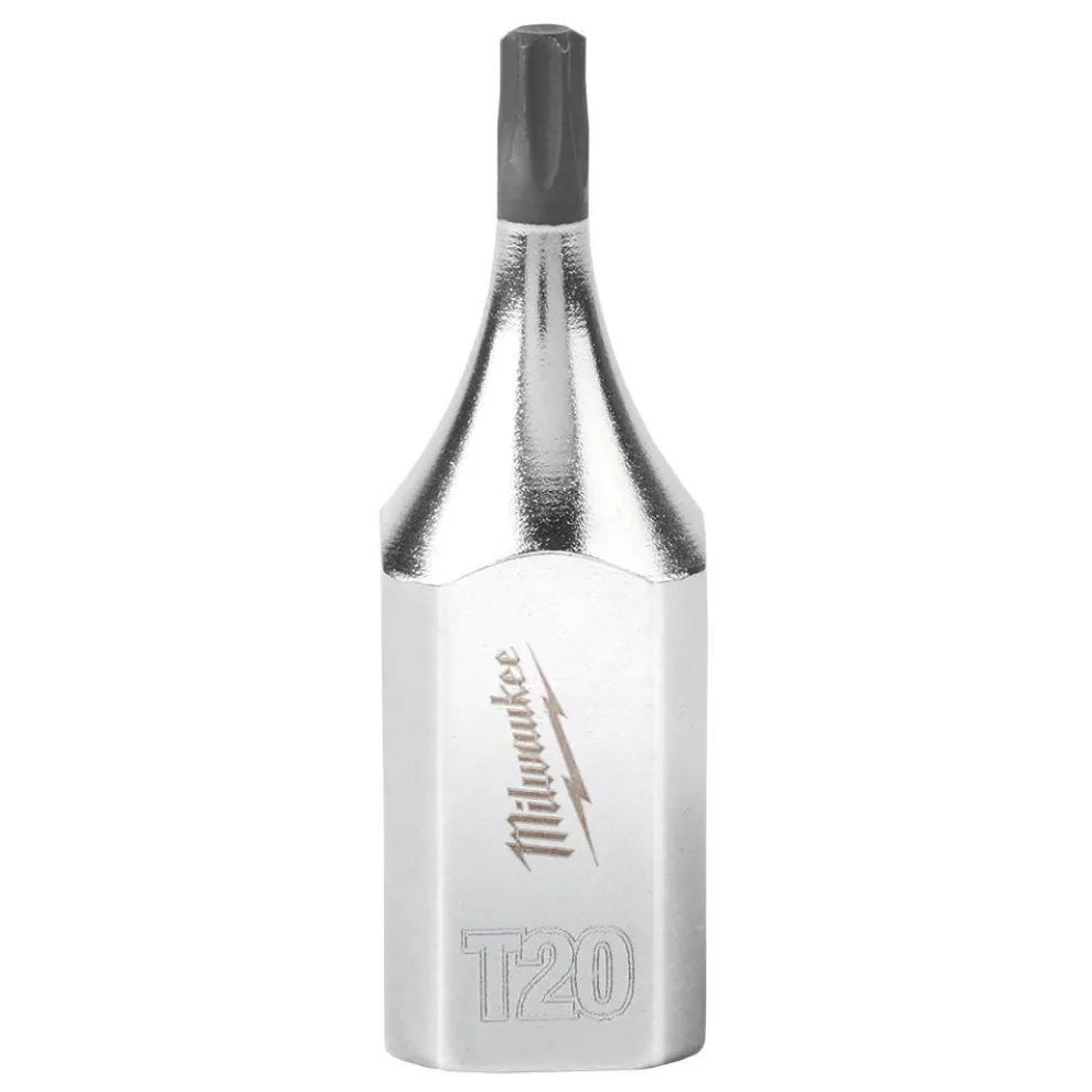 The MILWAUKEE TORX Bit Sockets with FOUR FLAT sides are designed from the ground up to be part of the most versatile socket family. Milwaukee bit sockets feature an innovative design with four parallel flat sides, which deter rolling and are wrench-compatible. This also creates a slim profile to provide the best access in tight spaces. The one-piece socket design offers improved durability compared to two-piece designs by eliminating the risk of the bit separating from the socket base. Laser engraved size markings provide easy identification and chrome plating offers rust and corrosion protection. All Milwaukee bit sockets are backed by a Lifetime Guarantee.