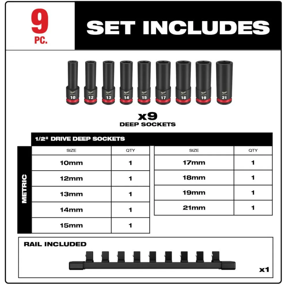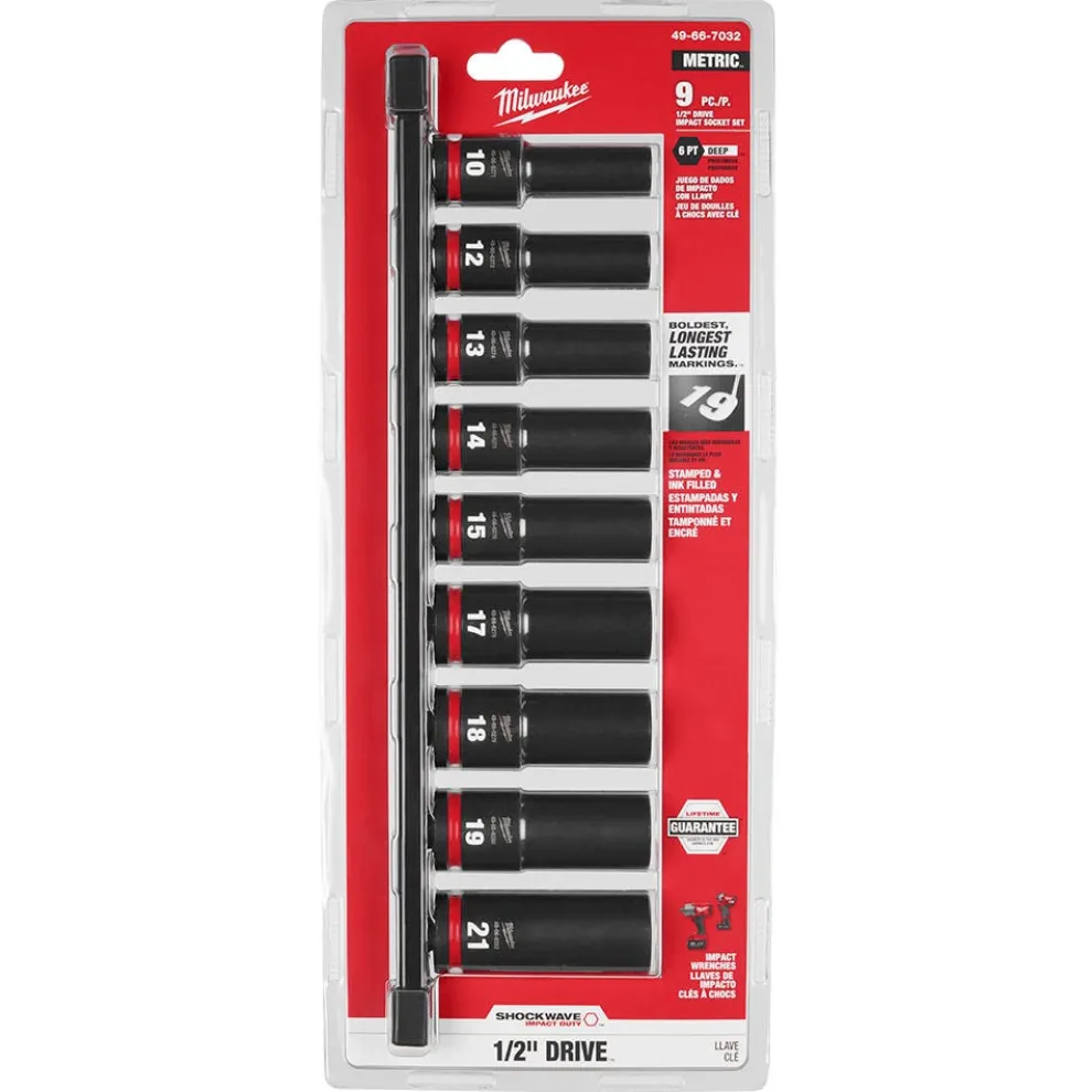 MILWAUKEE® 9-Piece SHOCKWAVE Impact Duty™ 1/2″ Drive Metric Deep 6 Point Socket Sets feature the boldest, longest-lasting markings and extreme impact durability in high torque applications. The stamped and ink-filled size marking enables you to select the right 6-Point Socket every time throughout the life of the socket. Milwaukee sockets are engineered with high strength forged steel for optimized performance in heavy-duty applications. The non-slip hex geometry prevents fastener rounding, and a dual-hole design and ring groove allow for easy socket attachment and removal. The customizable Socket Rail comes with removeable end caps to add or take off socket clips for optimal storage. All MILWAUKEE® SHOCKWAVE Impact Duty™ Sockets are backed by a Lifetime Guarantee and meet ASME industry standards.