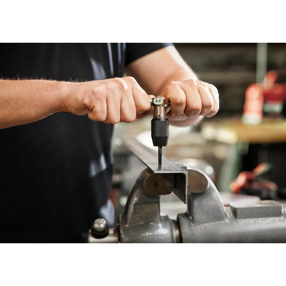 The MILWAUKEE ® Hex-LOK™ 2-in-1 Handle and Tap Collet is the most versatile threading solution for Tap and Die threading. The Hex-LOK™ 2-in-1 Handle combines the benefit of both internal and external threading within one handle by its compatibility with both 1” hex dies and the MILWAUKEE® Tap Collet. The handle’s ergonomic grip is designed to deliver ultimate user comfort while cutting threads. The all-metal construction allows for the tool-free die and tap collet changes and is optimized for maximum balance and control when threading. The MILWAUKEE® Tap Collet is designed for versatile tap threading and holds the widest tap range, used for all tap sizes up to 1/2”. With a durable all-metal dual jaw design, the MILWAUKEE® Tap Collet tightly secures taps for smooth, no wobble threading. The forward jaw holds taps 1/4”-1/2” while the recessed jaw secures taps up to 1/4”. The sliding T-Handle bar allows for use in tight or hard-to-reach spaces. The MILWAUKEE® Hex-LOK™ 2-in-1 Handle and Tap Collet are designed for use in the most common metal applications including brass, aluminum, mild steel, and more. Handle covered under a limited lifetime warranty.