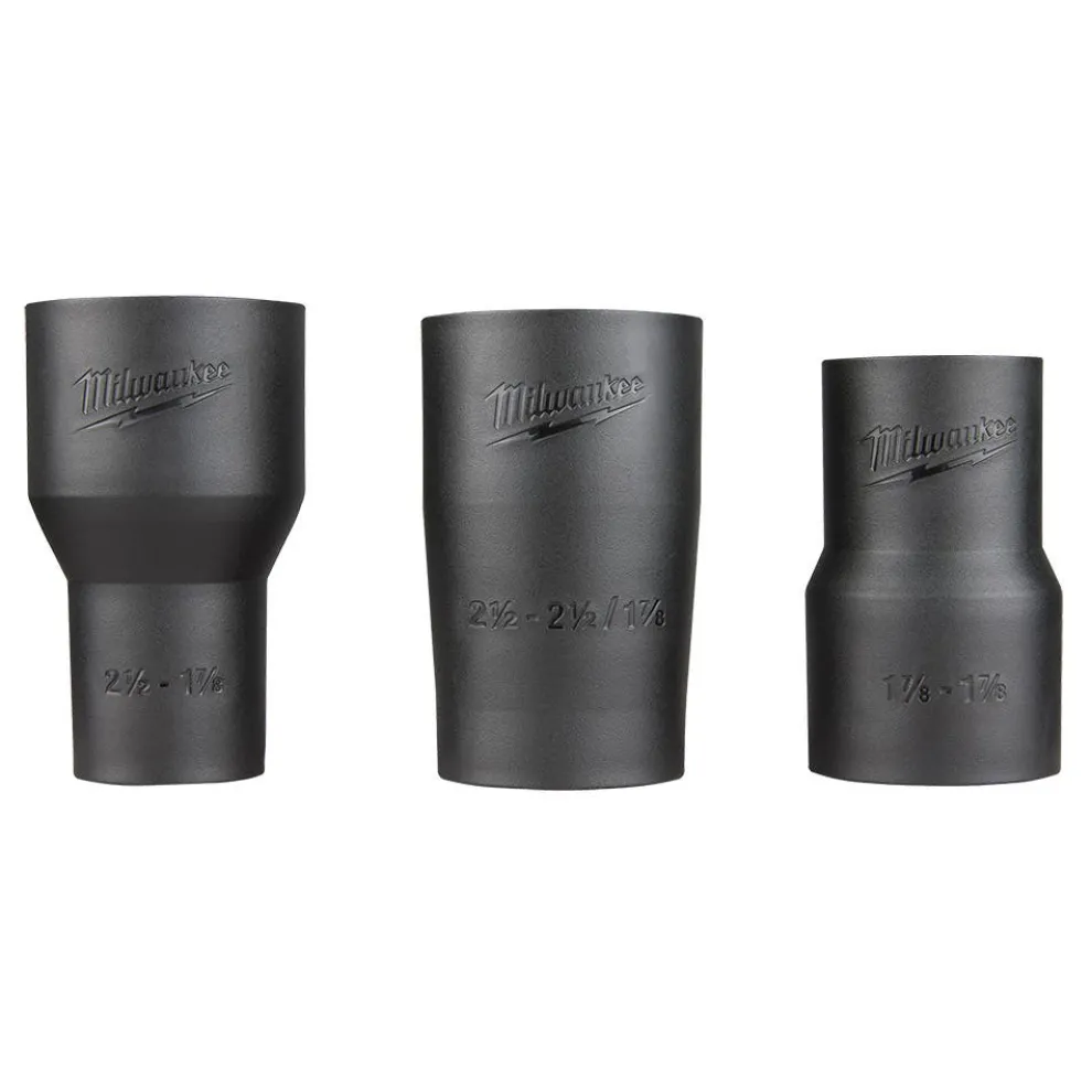 The MILWAUKEE Hose and Accessory Adapter Kit allows Milwaukee hoses to connect to the most common vacuum accessory and hose sizes. The kit includes three pieces: 2-1/2″ to 1-7/8″ Accessory Adapter, 2-1/2″ to 2-1/2″-1-7/8″ Hose Adapter, and a 1-7/8″ to 1-7/8″ Hose Adapter. These step adapters connect different diameter Milwaukee Vacuum Hoses and Accessories. Each adapter is marked with the diameters it connects between directly on the tool for easy identification.