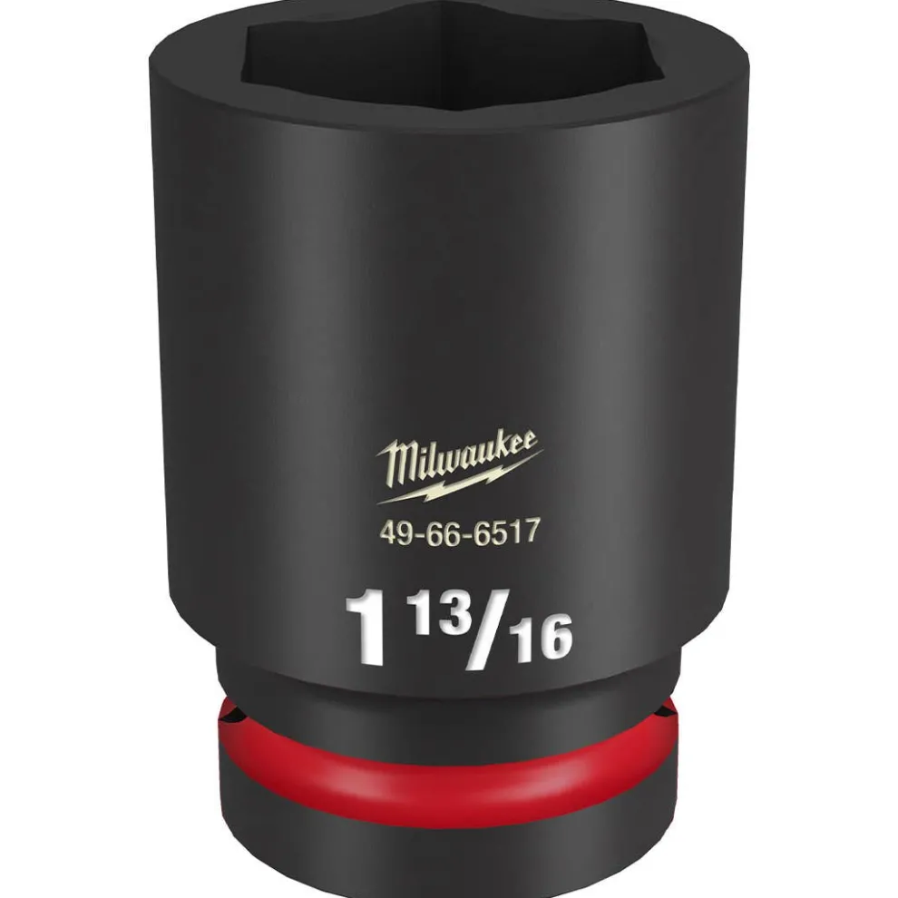 The MILWAUKEE SHOCKWAVE Impact Duty 1″ Drive 1-13/16″ Deep 6 Point Socket features the boldest, longest-lasting markings and extreme impact durability in high torque applications. The stamped and ink-filled size marking enables an accurate socket selection every time throughout the life of the socket. Engineered with high-strength forged steel for optimized performance in heavy-duty applications, and a non-slip hex geometry prevents fastener rounding. The dual-hole design and ring groove allow for easy socket attachment and removal. All SHOCKWAVE Impact Duty Sockets are backed by a Lifetime Guarantee and meet ASME industry Deeps. Compatible with optional Retaining Ring (49-66-6746).