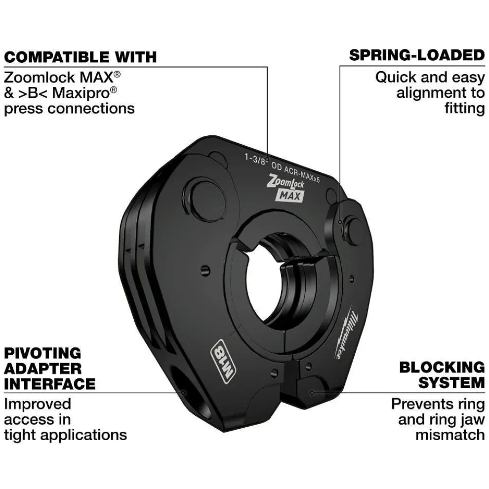 The MILWAUKEE® ACR Pivoting Press Rings are designed for use with M18™ & M12™ FORCE LOGIC™ Press Tools. The ACR Pivoting Press Ring is a more efficient alternative to sweat and solder, enabling you to press connections on copper tubing. Pivoting functionality delivers greater access in tight spaces when paired with a compatible Milwaukee® Ring Jaw and FORCE LOGIC™ Press Tool. Our press blocking system prevents improper ring and ring jaw mismatch, providing peace of mind in quality connections. The ACR Pivoting Press Rings, combined with a compatible Milwaukee® Ring Jaw and in-line FORCE LOGIC™ Press Tool, deliver unrivaled access in tight spaces, providing you with controlled, flameless copper connections for unmatched productivity.