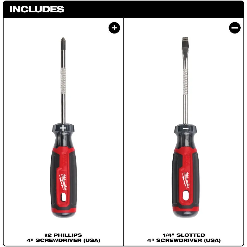 The MILWAUKEE 2-Piece Cushion Grip Screwdriver Set (USA) is manufactured to give the professional the best-fitting screwdriver with max grip. Milwaukee screwdriver tips are custom-machined to deliver a precise fit and reduce stripping during demanding fastening applications. For added confidence, the tips are laser etched to increase the gripping surface. Manufactured with high-strength, boron-infused steel for increased hardness, our screwdrivers stand up to the demands of the site with ultimate durability and life. Providing increased versatility, select screwdrivers include a wrench-ready bolster for added torque and a knurled shank for precision control. Quick identification markings on the handle make it easy to identify screwdriver tip size including Phillips, slotted, and cabinet tips. This 2-Piece Cushion Grip Screwdriver Set is made in the USA with cutting-edge manufacturing technology and the highest-quality, USA-sourced materials all backed by a complete Lifetime Guarantee.