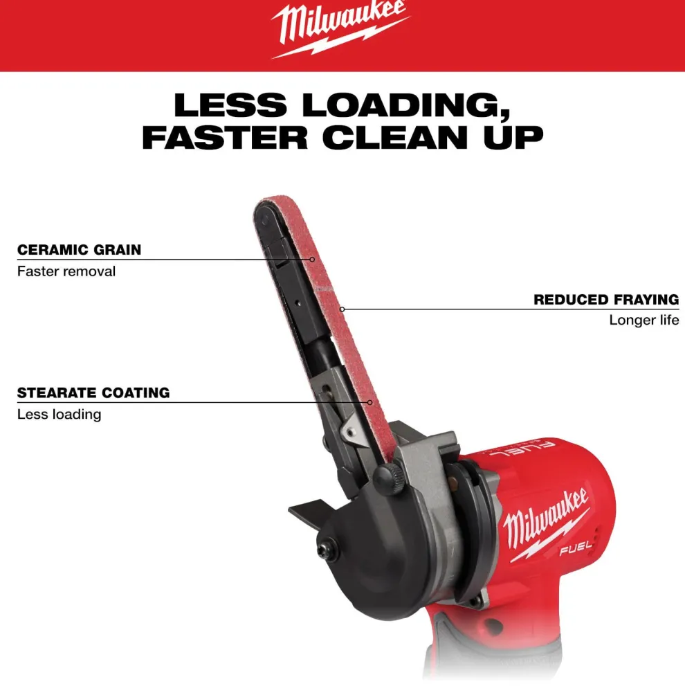 The MILWAUKEE® 3/8” x 13” 40 Grit Bandfile Belts deliver less loading for faster cleanup. This belt features a premium ceramic grain designed to file down surfaces faster than aluminum oxide. The durable Y-weight polyester, waterproof, cloth backing reduces edge fray and increases product life. Stearate Coating improves grain adhesion while reducing loading to ensure maximum productivity and cooler cutting. Accomplishes consistent, smooth clean-ups in metal, wood, plastic, and fiberglass. Available in 40-120 grits.