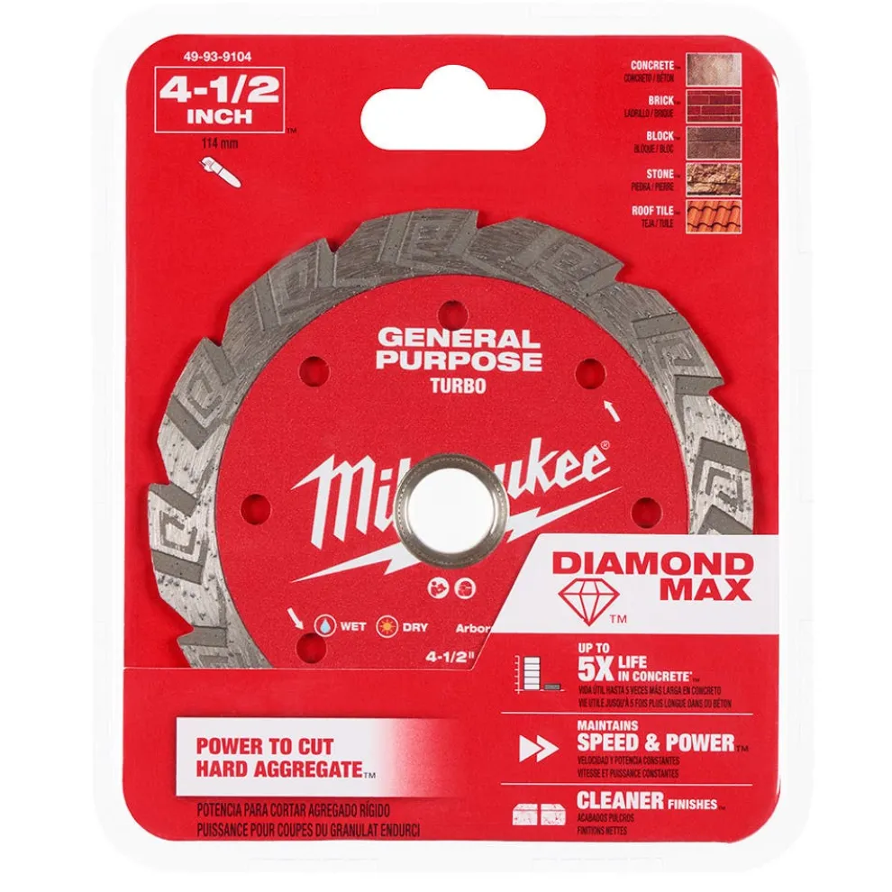 The MILWAUKEE DIAMOND MAX Turbo General Purpose Diamond Blades deliver the power to cut through hard aggregate. Designed with a unique diamond formula, these blades deliver up to 5x longer life in concrete. The serrated turbo rim is engineered to maintain speed and power in hard aggregate and other materials like concrete, brick, block, paver, and roof tile, while the notched turbo edge provides cleaner finishes. The vented steel core keeps the blade cool and ensures consistent cuts throughout the life of the blade. For use wet and dry.