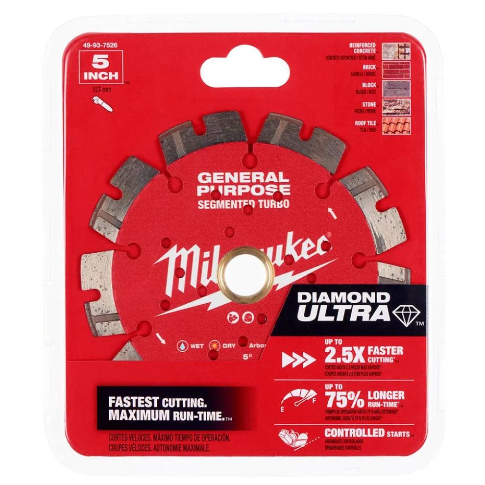 The MILWAUKEE Diamond Ultra Segmented Turbo General Purpose Diamonds Blades are engineered to deliver the fastest cutting speeds and maximum run time to significantly increase productivity. The turbo notch design allows for up to 2.5x faster cutting in concrete. These segmented blades are equipped with laser welded segments, providing increased durability in tough materials; including cured concrete, reinforced concrete, stone, paver, brick, and block. The Diamond Ultra blades are designed with a vented steel core to keep the blade cool for consistent, fast cutting and up to 75% longer run time. The turbo notch segments, engineered with a beveled edge, deliver smooth starts & faster plunge cuts. These general-purpose blades are designed with keyhole gullets for rapid debris removal and extended blade life. For use wet and dry.