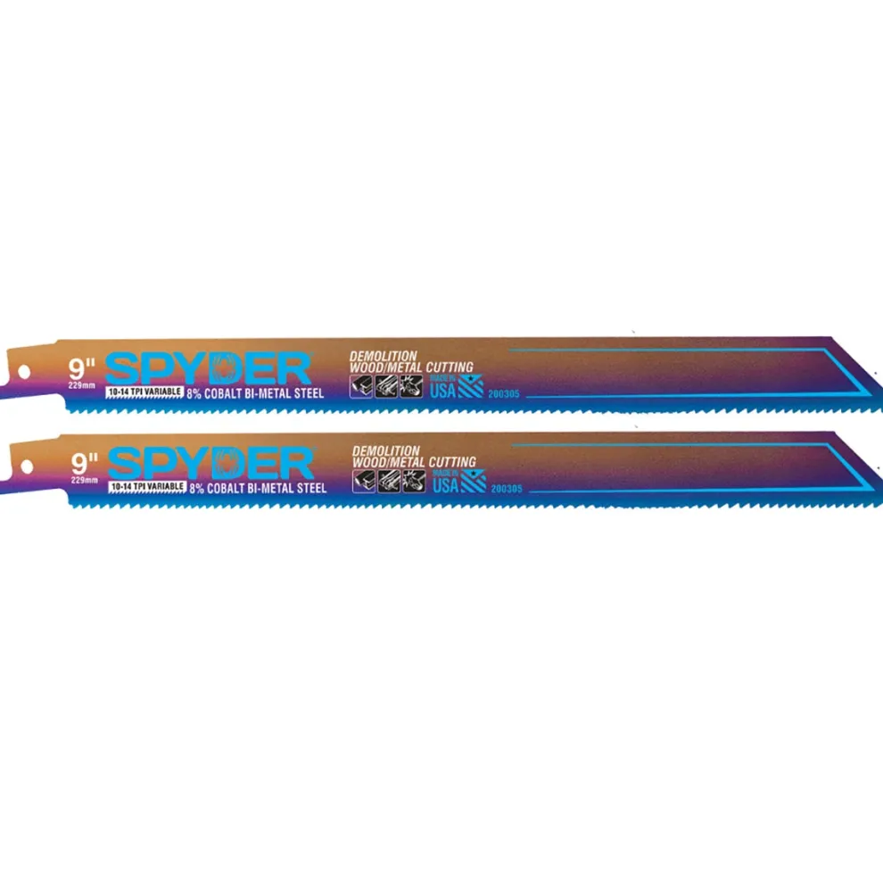 Spyder Mach-Blue™ reciprocating saw blades cut through a variety of tough materials ranging from wood with nails, to steel and stainless steel, to plastics and more. Proprietary Mach-Blue™ plating retains sharper cutting edges and reduces heat build-up, resulting in faster cuts and exceptionally long blade life – up to 20x longer lasting than conventional bi-metal blades.