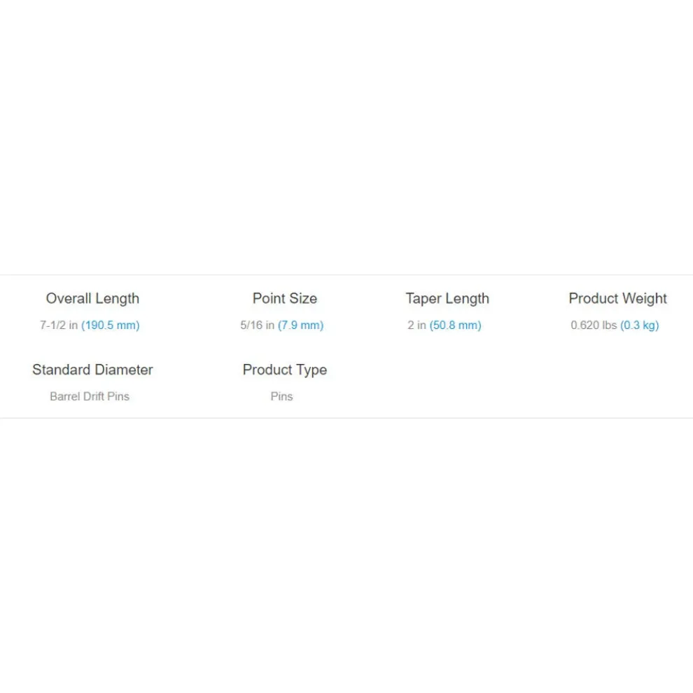 - 7-1/2 in (190.5 mm) Overall Length; 11/16 in (17.5 mm) Standard Diameter; 2 in (50.8 mm) Length of Taper; 5/16 in (7.9 mm) Point Size; Barrel Drift Pin