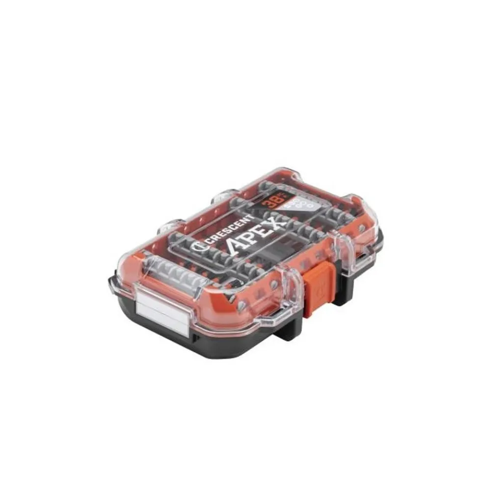 The Crescent 38-piece fastening set is built for the most demanding jobsites. The stack and store alphaCASE™ features a tongue and groove design with thick sidewall construction. The 38-piece set includes a bonus Crescent patented non-marring u-GUARD covered bit holder which protect final finishes from damage, and the Crescent VORTEX™ line of torsion bits with optimized tip geometry for fit to the fastener. Screwdriving bit tips include Square, Phillips®, Torx®, Slotted. Bits are secured in pivoting insert rails inside the case, allowing easy access to bits and case configurability.