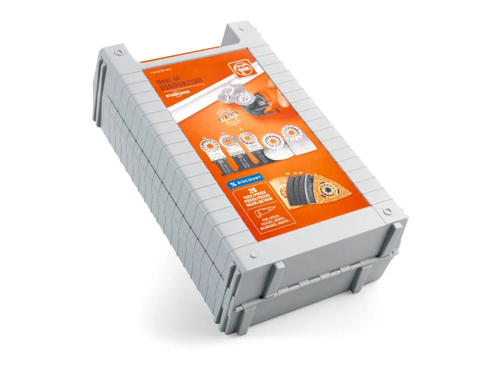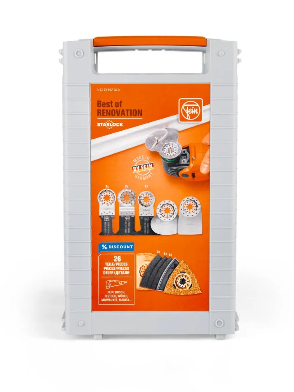 Best of Starlock RENOVATION|26-piece accessory set for all your renovation work. Suitable for all FEIN MultiTools and all other commercially available multi-tools with the Starlock mount. As a set, attractive savings compared to individual purchase. Contents: 6 E-Cut Long Life saw blades (2 pc. each 2 [50] x 1-3/8 [35] in[mm], 2 [50] x 2 [50] in[mm], 2 [50] x 2-9/16 [65] in[mm]), 1 carbide rasp (3-1/8 [80] in[mm]), 1 carbide segment saw blade (Dia. 3 [75] in[mm], 3/32 [2.2] in[mm]), 1 rigid scraper, 1 cutter blade (mushroom-shaped), 1 sanding pad, unperforated (3-1/8 [80] in[mm]), 5 sanding sheets each (grits 60, 80, 120).