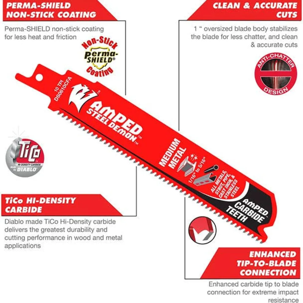 Diablo’s new range of Steel Demon AMPED reciprocating saw blades are “AMPing Up” medium metal cutting with the introduction of the industry’s first ever industrial grade coating, Black Industrial Cooling Element (I.C.E.). The ultra-slick Black I.C.E. provides the coolest and cleanest cutting edge, and an ultra-superior chip evacuation. High performance carbide delivers an unmatched up to 100 times longer cutting life versus standard bi-metal blades in strut, pipe, stainless steel and all other metals ranging in thickness from 1/16 in. to 5/16 in. The combination of Black I.C.E. and Diablo’s carbide delivers extended life and an impressive up to 2X increased performance vs. standard metal cutting carbide reciprocating saw blades.