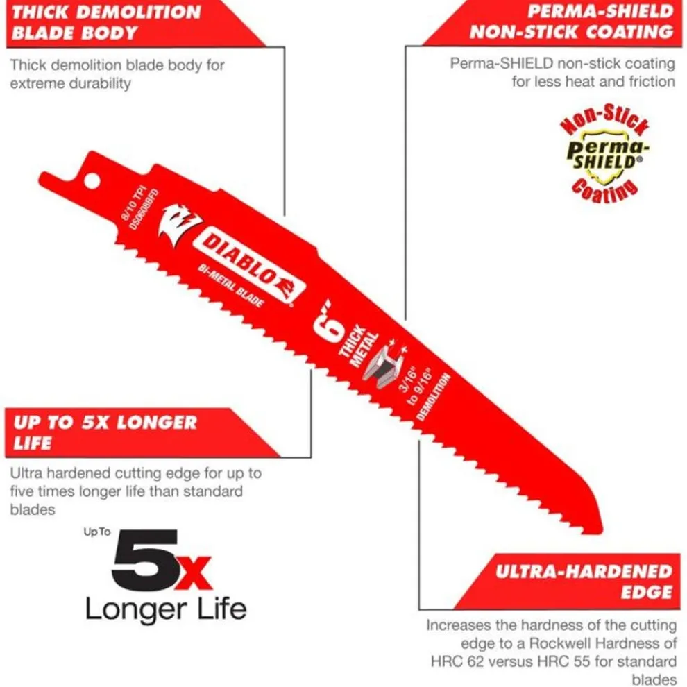 Diablo’s reciprocating saw blades are specifically designed for maximum performance in metal demolition applications. The blade’s ultra hardened cutting edge delivers up to five times longer life than those of standard blades. Dual Tooth design features a double tooth configuration with small gullets for faster material removal and extra durability.