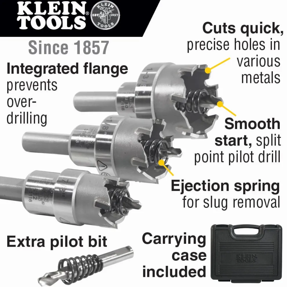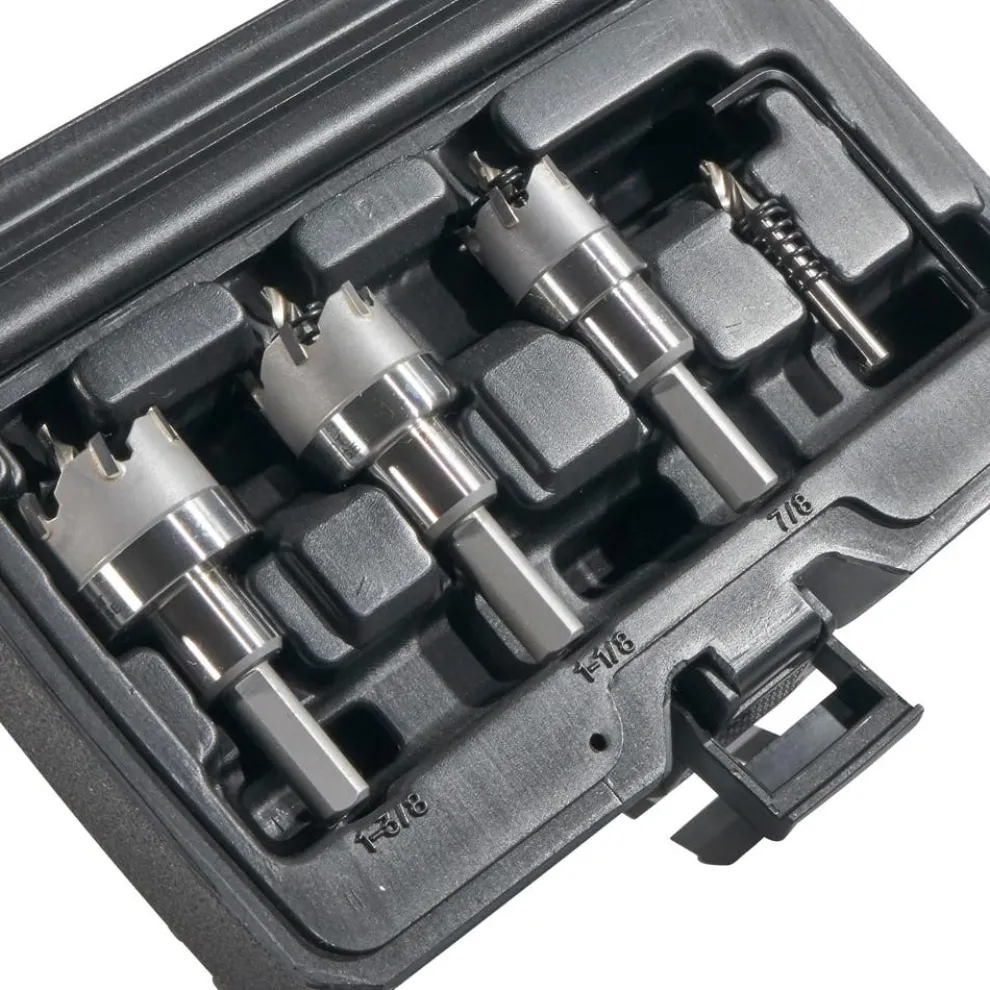 This 4-piece Carbide-Tipped Hole Cutter kit cuts quick, precise holes in a variety of materials. Set includes three commonly used sizes plus an extra pilot bit. Integrated flange prevents the operator from drilling beyond the sheet metal. Split point pilot drill bit prevents bit walking.