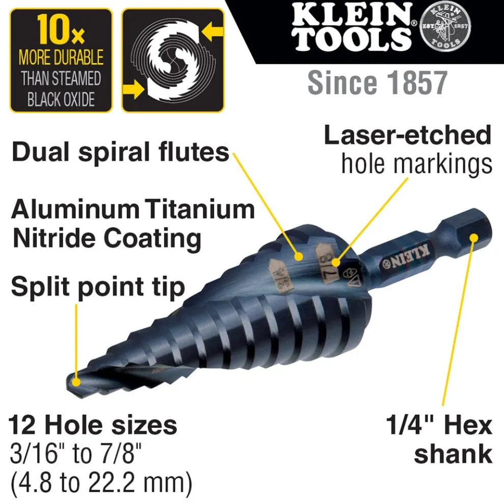 - Step bits are coated with aluminum titanium nitride and are 10 times more durable than steamed black oxide coating for longer bit life