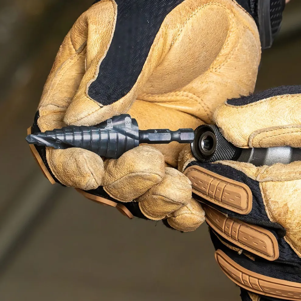 The Premium Electrician’s Quick Release Step Bit Kit contains 3 step bits sized 7/8-Inch, 1-1/8-Inch, and 1-3/8-Inch for creating hole cutouts in panels and j-boxes to accommodate most commonly used 1/2-Inch, 3/4-Inch, and 1-Inch conduit. Dual Spiral Flutes help pull the step bit through the material for faster cutting. The aluminum titanium nitride coating is 10 times more durable than steamed black oxide for longer bit life. Impact rated, the 1/4-Inch hex shank provides a firm, positive grip and allows quick and convenient usage with an impact driver and a drill. The compact, modular case comes with cutting oil and is designed to nest neatly within MODbox toolboxes and on the MODbox Case Adapter Side Rail Attachment.
