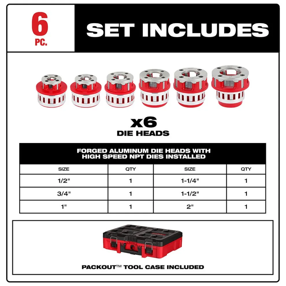| Package Contents | (1) 1/2″ HS NPT Die Head, (1) 3/4″ HS NPT Die Head, (1) 1″ HS NPT Die Head, (1) 1-1/4″ HS NPT Die Head, (1) 1-1/2″ HS NPT Die Head, (1) 2″ HS NPT Die Head, |