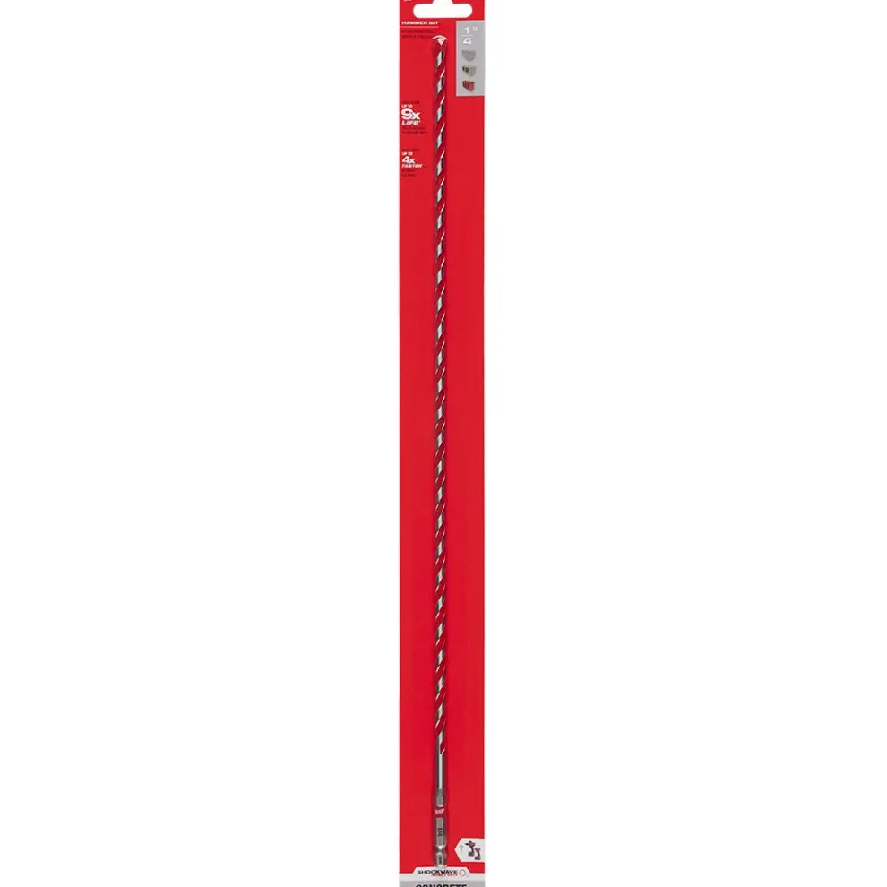 The MILWAUKEE SHOCKWAVE Impact Duty Carbide Hammer Drill Bits are designed with sharpened carbide to deliver up to 9x longer life and 4x faster drilling into concrete. Engineered with a precision ground tip, these bits deliver faster starts and less walking in concrete, brick, and block. Wide flute design removes dust faster, reducing heat and delivering more holes per charge. Equipped with a 1/4″ Hex Shank, Milwaukee SHOCKWAVE Impact Duty Carbide Hammer Drill Bits are the ideal solution for drilling in masonry materials with both impacts and hammer drills/drivers. Available in diameters up to 1/2 inch.