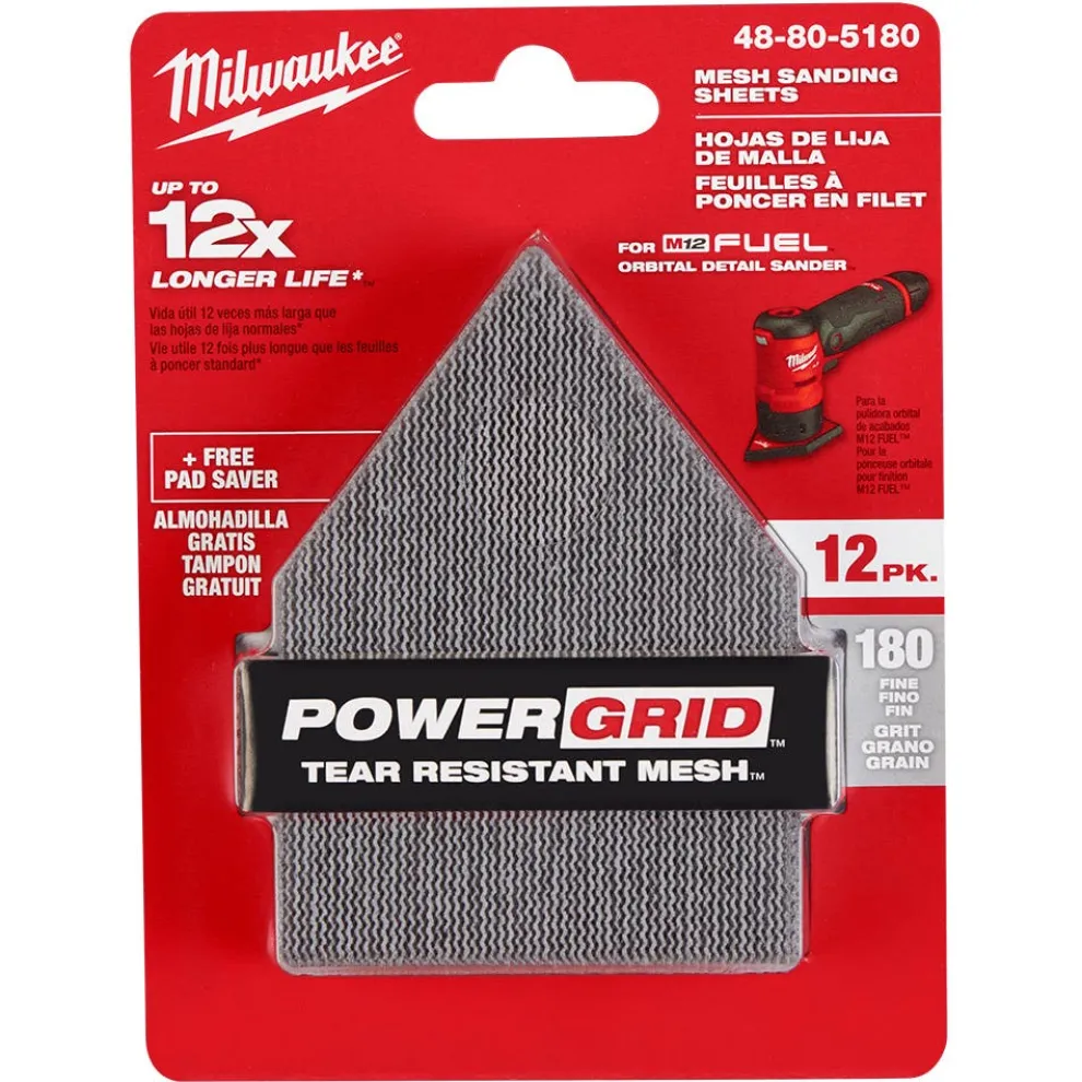 The MILWAUKEE Mesh Sanding Sheets for M12 FUEL Orbital Detail Sander are designed with MILWAUKEE POWERGRID Tear Resistant Mesh for maximum durability, delivering up to 12x longer life vs. standard sandpaper. These Mesh Sanding Sheets use an open weave design to minimize clogging and reduce material build-up for a smooth and flawless finish. The durable nylon backing increases protection against sharp edges, tight corners, and tough material removal applications while utilizing sharp aluminum oxide grain for faster finishing. The reusable mesh sanding sheets are easy to clean for longer life; simply shake, vacuum, blow or rinse to clear away debris. The high-quality hook and loop provides a secure connection and fast grit swaps. Sanding sheets are available in 80 grit – 400 grit for use in wood, metal, and plastics.