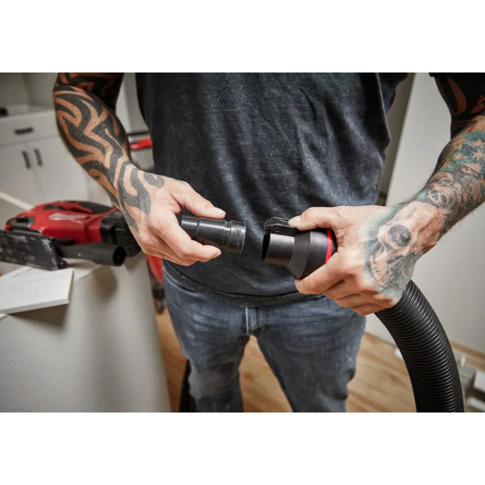 The MILWAUKEE 2-1/2″ Dust Extraction Adapter Kit allows Milwaukee 2-1/2″ Hoses (49-90-2004, 49-90-2006) to connect to most power tools for dust collection directly from the tool. The dust extraction kit includes three adapters for multiple different uses and tool fitment. The Hose Clip Adapter screws onto the end of the hose and connects directly to Milwaukee power tools or the other two adapters. The Power Tool Adapter clips into the Hose Clip Adapter and provides a friction fit to most power tool dust ports. The Table Saw Adapter clips into the Hose Clip Adapter and provides a secure connection to 2-1/2″ table saw dust ports. The Milwaukee 2-1/2″ Dust Extraction Adapter Kit includes a red color ring for quick identification of its 2-1/2″ diameter.