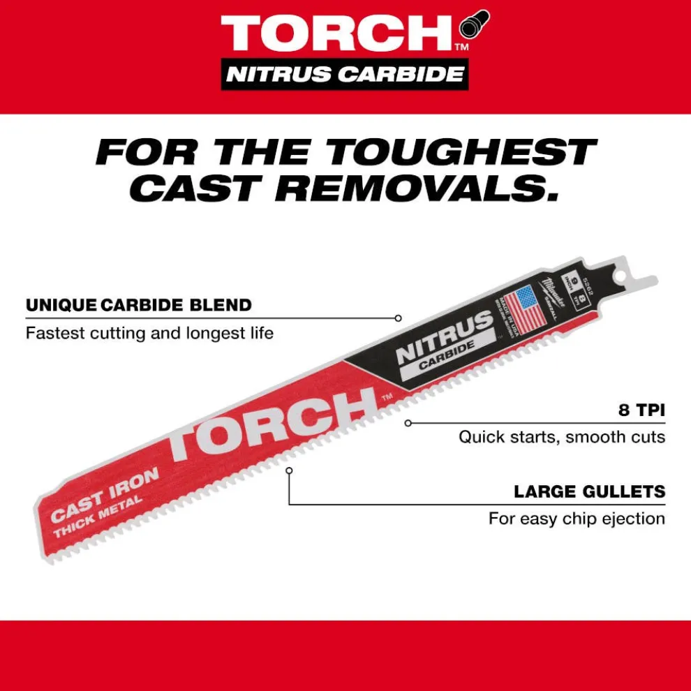 - (1) 9″ 8TPI TORCH w/ NITRUS CARBIDE SAWZALL Blade