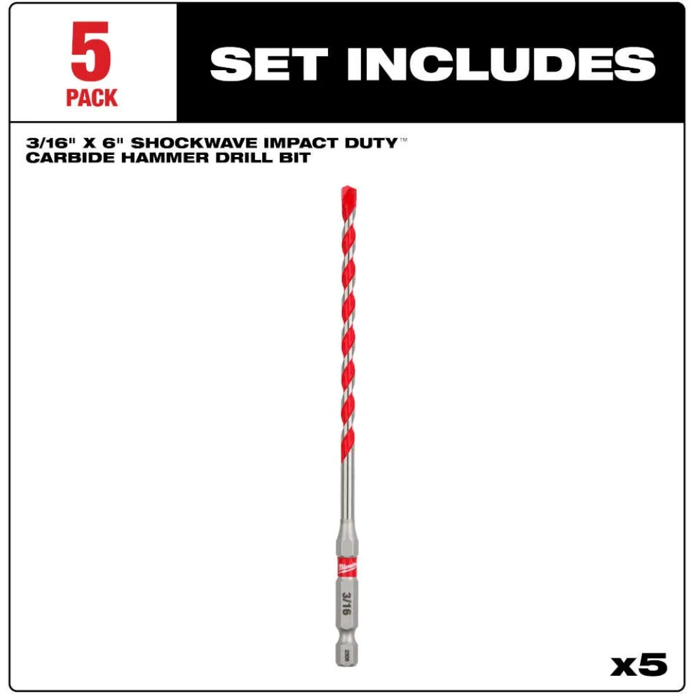 - Includes (5) 3/16″ x 6″ Hammer Drill Bits