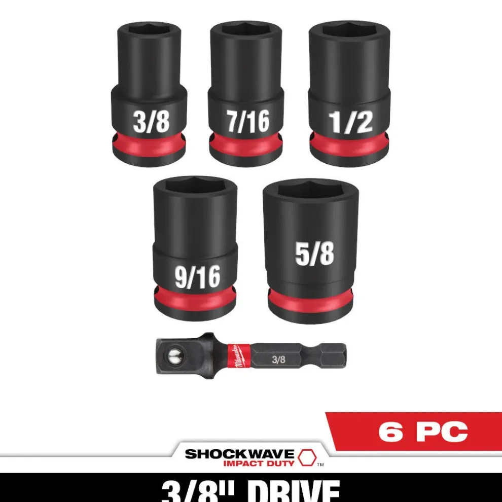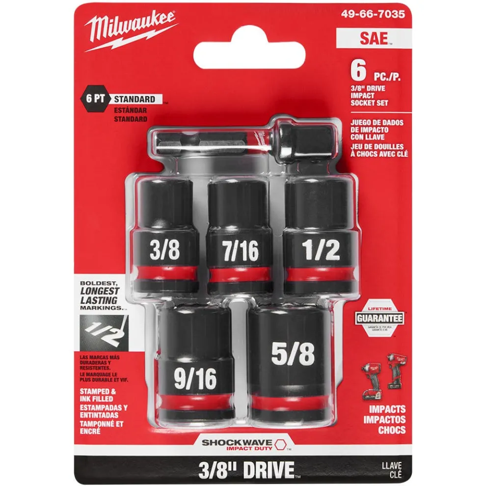 MILWAUKEE® 6-Piece SHOCKWAVE Impact Duty™ 3/8″ Drive SAE Standard Socket Sets feature the boldest, longest-lasting markings and extreme impact durability in high torque applications. The stamped and ink-filled size marking enables you to select the right Standard Socket every time throughout the life of the socket. Milwaukee sockets are engineered with high strength forged steel for optimized performance in heavy-duty applications. The non-slip hex geometry prevents fastener rounding, and a dual-hole design and ring groove allow for easy socket attachment and removal. All MILWAUKEE® SHOCKWAVE Impact Duty™ Sockets are backed by a Lifetime Guarantee and meet ASME industry standards.