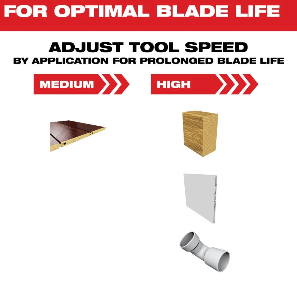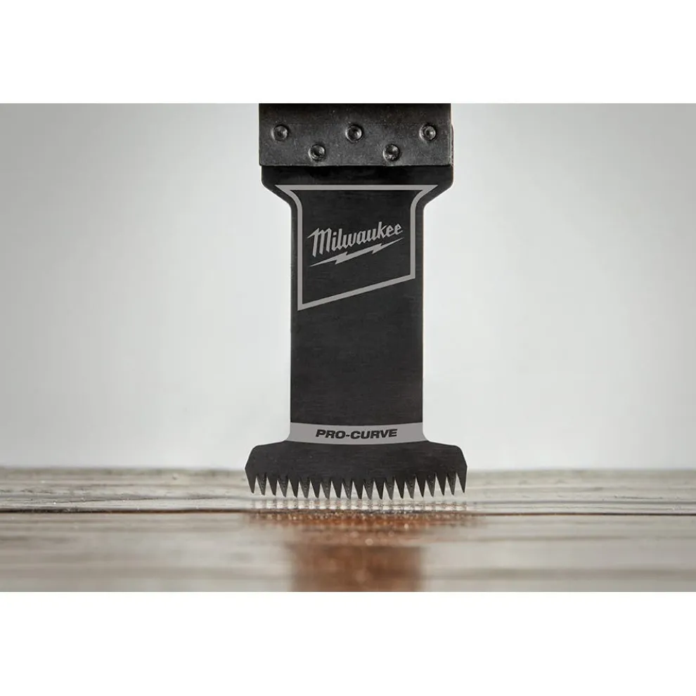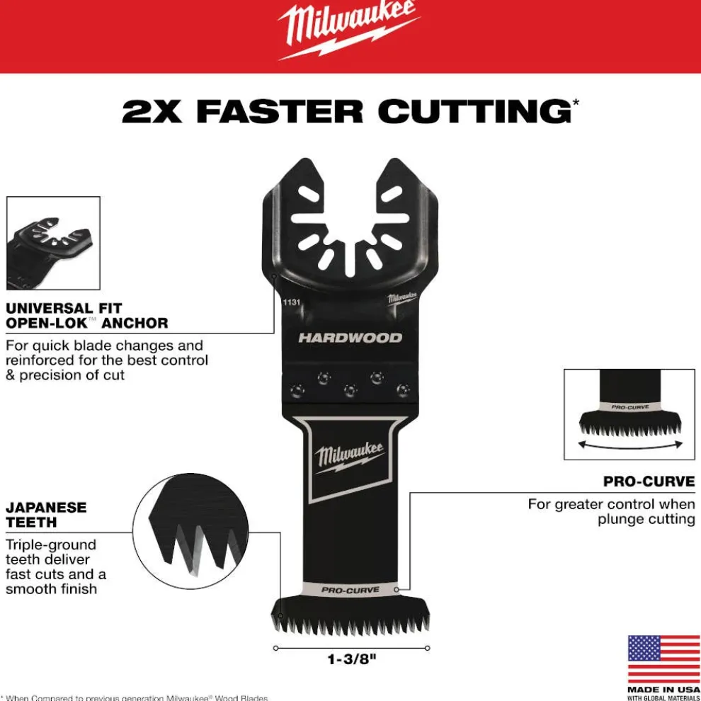 The MILWAUKEE OPEN-LOK 1-3/8″ HCS Japanese Tooth PRO-CURVE Hardwood Oscillating Multi-Tool Blades are made from premium high carbon steel and feature precision triple-ground Japanese teeth for up to 2X faster cuts than the previous generation of high carbon steel blades. The Japanese Tooth hardwood blades have a PRO-CURVE cutting edge for greater control and accuracy while cutting. The combination of Japanese Teeth and PRO-CURVE cutting edge make this blade the optimal solution for precise cuts with a smooth finish in hardwood, wood, PVC, drywall, and other soft materials. These blades feature a reinforced Universal Fit OPEN-LOK anchor for better strength & control and allow for quick blade changes across 100+ multi-tools. Not compatible with Starlock tools. Milwaukee oscillating multi-tool blades are designed and made in the USA with global materials.