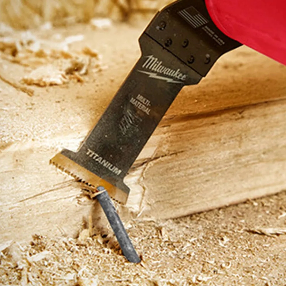 The MILWAUKEE Universal Fit OPEN-LOK 1-3/8″ Titanium Enhanced Bi-Metal Oscillating Multi-Tool Blade 10 Pack is made from premium high-speed steel. This 1-3/8″ bi-metal blade is ideal for cuts in wood, nails, PVC, and drywall. The titanium enhanced bi-metal multi-tool blades deliver faster cuts vs the previous generation, featuring more teeth with an increased cutting width and a deeper plunge cut. These oscillating multi-tool blades are designed and made in the USA with global materials.