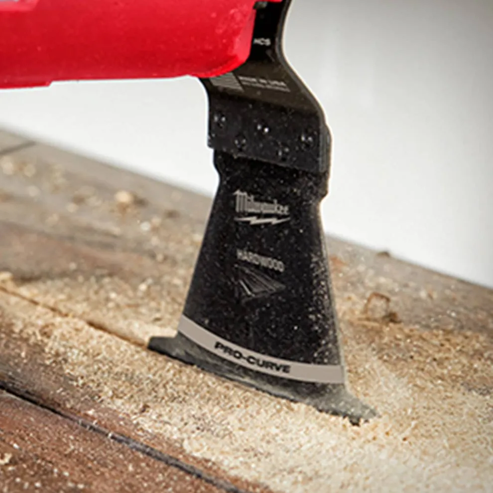 The MILWAUKEE UNIVERSAL FIT OPEN-LOK 2-1/2″ HCS Japanese Tooth PRO-CURVE Hardwood Blade 1 Pack for Oscillating Multi-Tools is made from premium high carbon steel. This hardwood multi-tool blade has precision triple ground Japanese teeth and now includes PRO-CURVE for greater control and accuracy. This is Milwaukee’s best multi-tool blade for making precise cuts with a smooth finish in hardwood and can also be used in other woods, PVC, drywall, and other soft materials. This Milwaukee blade delivers up to 2X faster cuts than the previous generation of high carbon steel blades with a deeper plunge cut and a wider 2-1/2″ cutting width. This multi-tool blade is designed and made in the USA with global materials.