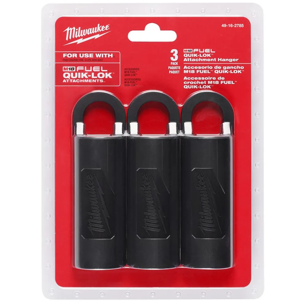 The MILWAUKEE M18 FUEL QUIK-LOK Attachment Hangers are used to hang up your attachments. The attachment hangers have a twist lock design with a loop to conveniently hang on a nail or a hook. They are durable and made of an impact-resistant polymer that resists cracking and chipping. These hangers are compatible with all M18 FUEL QUIK-LOK attachments.