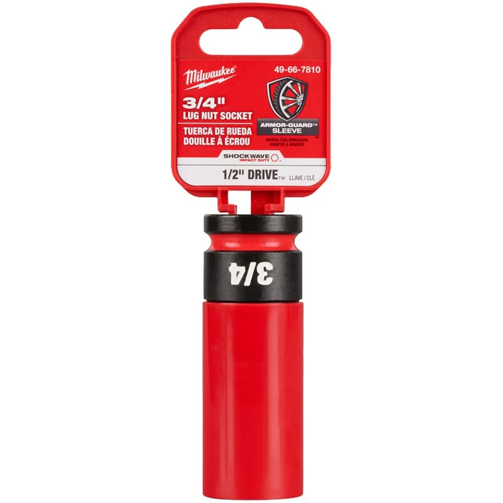 MILWAUKEE SHOCKWAVE Impact Duty 1/2 Drive 6 Point Lug Nut Wheel Sockets feature the Most Durable, Non-Marring Sleeve to protect rims during tire changes. The ARMOR-GUARD Sleeve is made with premium, durable plastic for Lasting Protection against cracking or shredding during wheel installation and removals. The sockets are thin-walled for easy access in tight wheel assemblies and feature a non-marring plastic insert to protect lug nuts during use. The sleeves are color-coded, Gray for Metric sizes and Red for SAE sizes, to ensure easier socket selection while also featuring stamped & ink filled sizes for the Boldest, Longest Lasting markings. Milwaukee sockets are engineered with high strength forged steel for optimized performance in heavy-duty applications. The dual-hole design and ring groove allow for easy socket attachment and removal. MILWAUKEE SHOCKWAVE Impact Duty Lug Nut Wheel Sockets are optimized for use with 1/2″ drive impact wrenches, drivers, ratchets, and adapters and meet ASME industry standards for thin-walled sockets.
