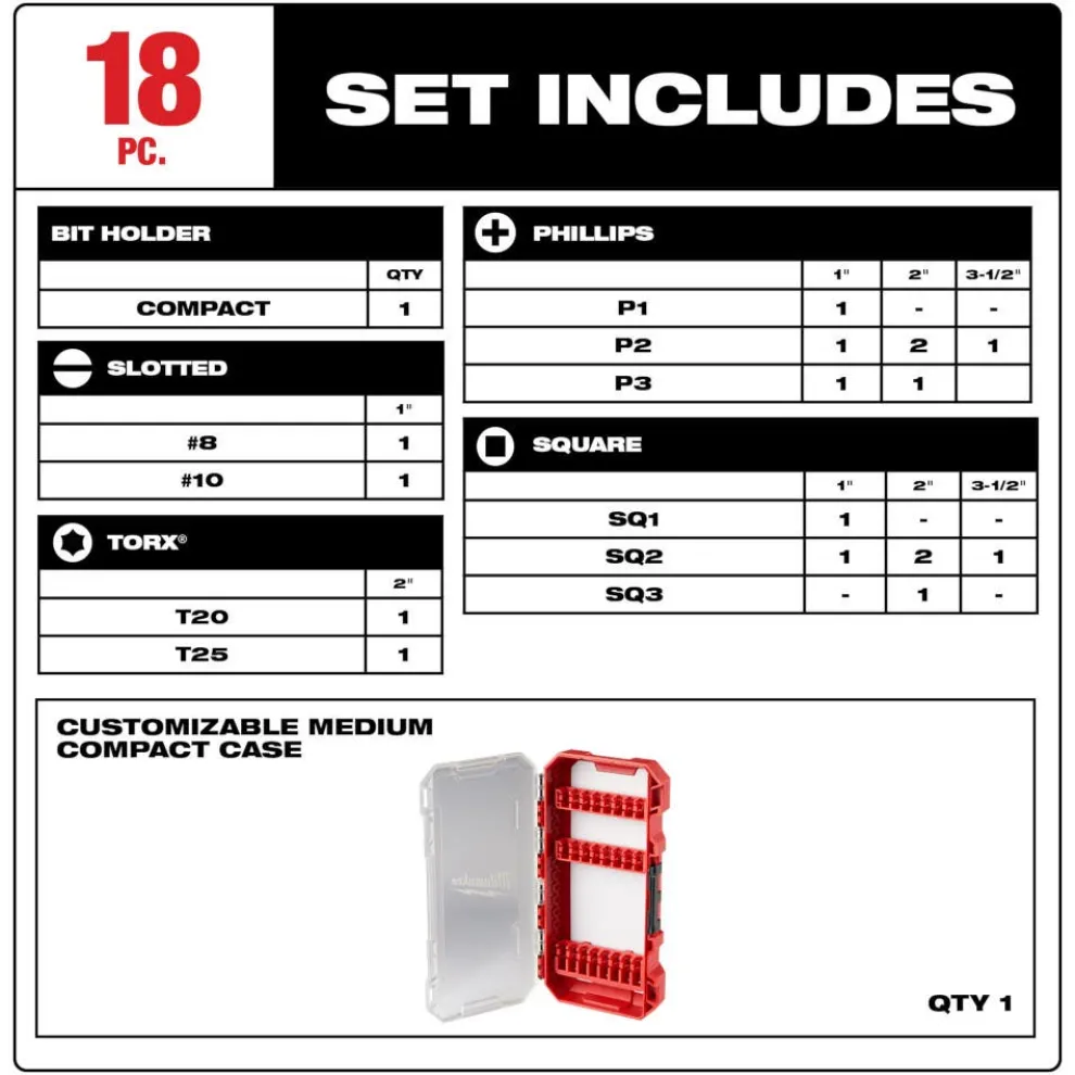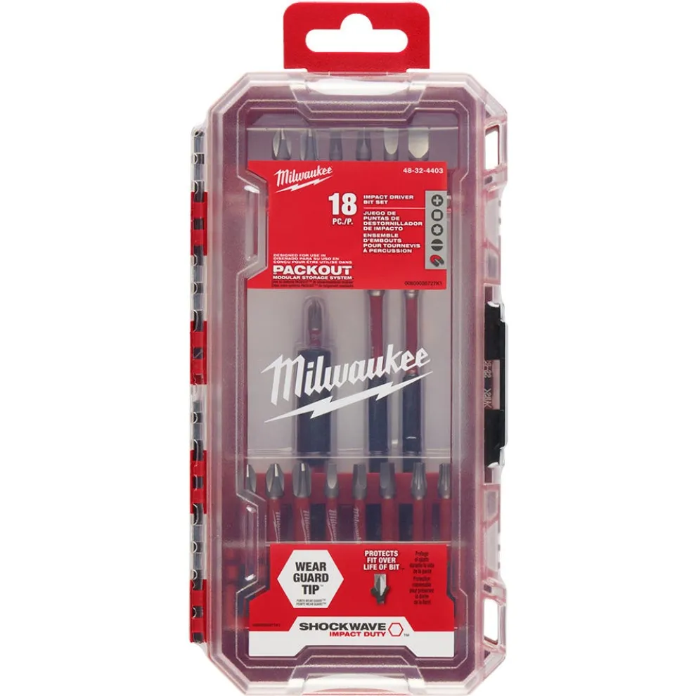 The MILWAUKEE SHOCKWAVE Impact Duty 18PC Driver Bit Set is engineered to be the Most Durable, Best Fitting driver bits on the market. The WEAR GUARD TIP delivers increased wear resistance which protects the impact bit’s fit over the life of the bit. The SHOCK ZONE is optimized for each tip type and length of driver bit in the set to absorb peak torque and prevent breaking. The driver bits are made from CUSTOM ALLOY76 steel and a proprietary heat treatment process to extend bit life, providing up to 50X life versus other impact driver bits on the market. The Milwaukee SHOCKWAVE Impact Duty driver bits are built to provide users with extreme durability for the most demanding applications. The set is organized in a customizable accessory case designed for use in PACKOUT.