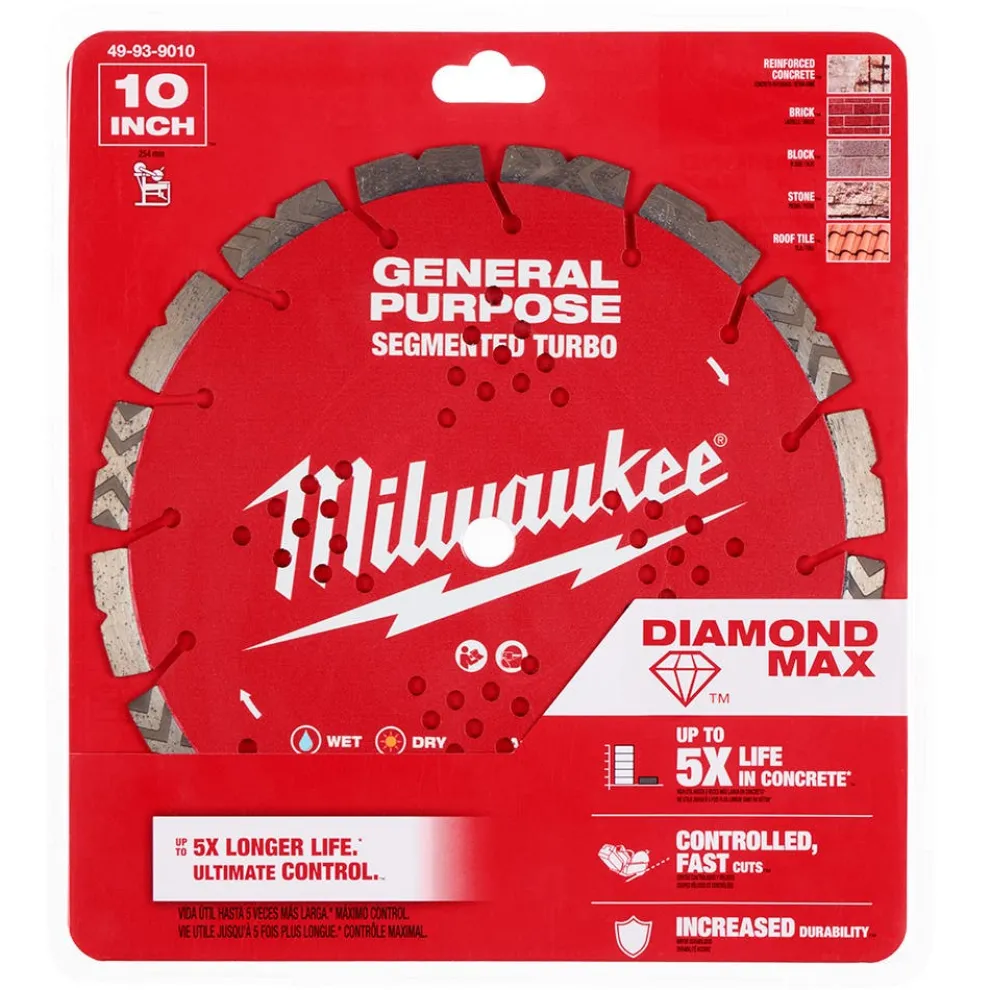The MILWAUKEE DIAMOND MAX Segmented Turbo General Purpose Diamond Blades deliver up to 5x longer life in concrete and ultimate control. The alternating turbo x-segments deliver more control and faster cuts. Each segment is laser welded to the steel core for increased durability in tough materials; including cured concrete, concrete with rebar, stone, paver, brick, block, and roof tile. These general-purpose diamond blades are designed with slanted keyhole gullets for rapid debris removal. The DIAMOND MAX blades are designed with a vented steel core to keep the blade cooler during cuts. For use wet and dry.