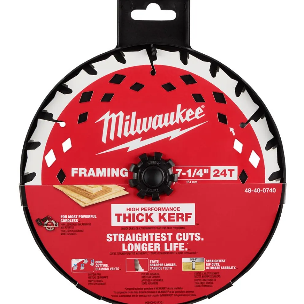 The MILWAUKEE Thick Kerf Framing Circular Saw Blades offer the straightest cuts and longer life in wood. These blades are designed with a High Performance Thick Kerf, allowing you to get the straightest rip cuts and ultimate stability in softwoods, hardwoods, lumber, and laminated woods. The diamond venting pattern allows for cool cutting and improved chip ejection while the cobalt-infused carbide teeth stay sharper longer. These Thick Kerf Framing Blades are optimized for the most powerful cordless saws, providing strong performance even at the highest RPMs.