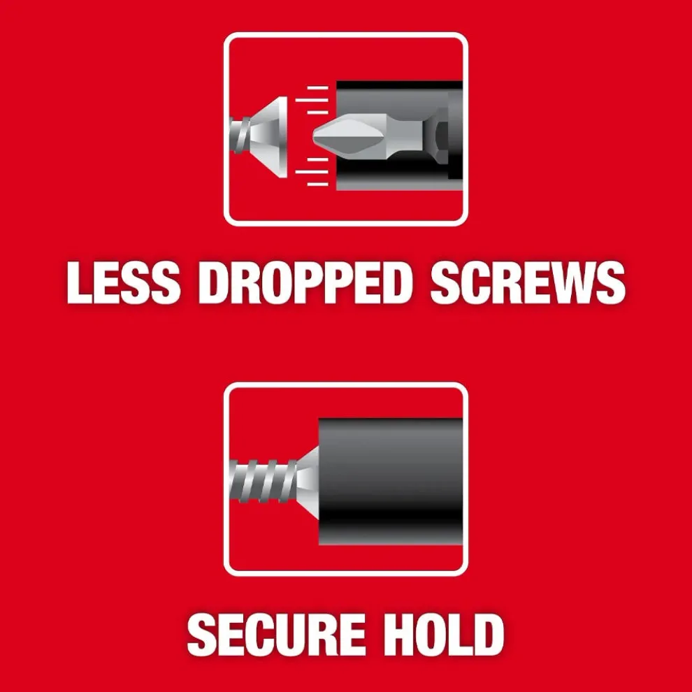 Our SHOCKWAVE™ Impact Duty Screw-Holding Bit Holder securely holds screws for easy One-Handed Fastening. The bit holder directly engages screws when the outer sleeve is slid up, leading to fewer dropped screws on the job site. The screw is held to the bit holder by a ring magnet on the front of the sleeve, allowing for the easiest driving. The optimized SHOCKZONE™ shank absorbs peak torque and prevents breaking.