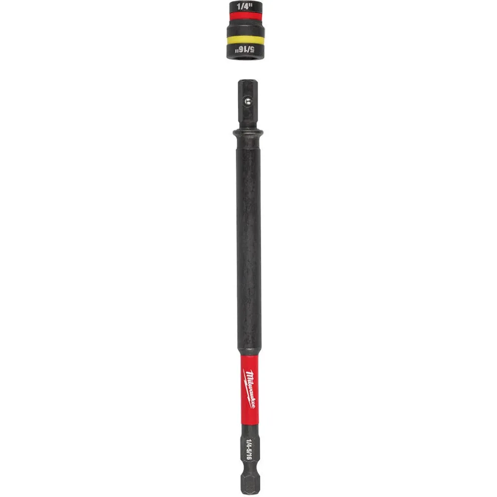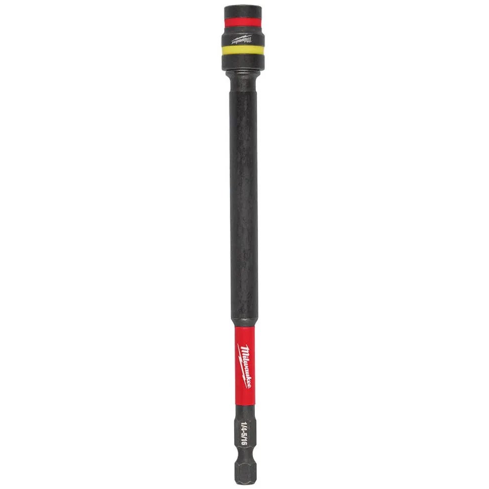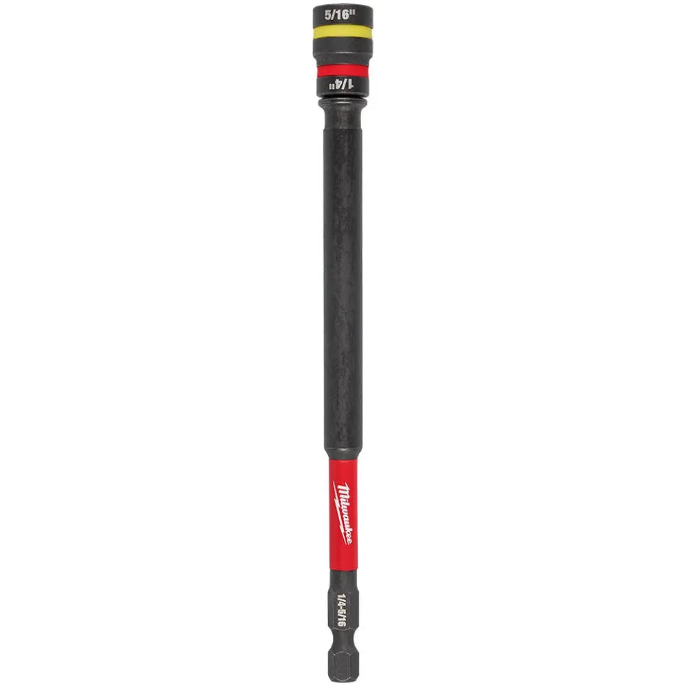 The MILWAUKEE® SHOCKWAVE™ Impact Duty QUIK-CLEAR™ 2-in-1 Magnetic Nut Driver is the most durable, cleanable nut driver. The QUIK-CLEAR™ cleaning mechanism allows for fast and easy removal of metal shavings from the magnet to prevent fastener head stripping. The 2-in-1 nut driver design offers 1/4″ and 5/16″ nut driver sizes on one shank to allow for maximum versatility when driving hex head screws on the job site. The QUIK-CLEAR™ 2-in-1 Magnetic Nut Drivers feature a powerful magnet that prevents it from loosening over time to enable a consistent, secure grip and unyielding fastener engagement. The optimized SHOCKZONE™ shank absorbs peak torque and prevents breaking. Made from heat-treated CUSTOM ALLOY76™ steel to control hardness and extend bit life. The nut drivers feature two color-coded rings for quick and easy size identification. Designed for use with impact drivers and drill drivers.
